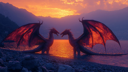 A pair of powerful, scaly dragons with horns and long tails stand face-to-face. Their large, leathery wings glow with a fiery red and orange translucent light.