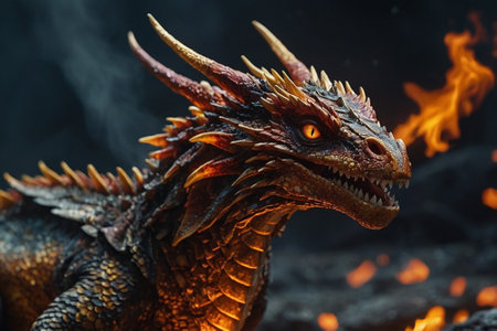 3D rendering of a fantasy dragon with fire flames and hot lava