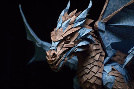close-up of a detailed origami dragon on a dark background, created with generative ai