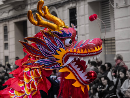 Chinese new year dragon puppet winding through crowded street, capturing parade excitement