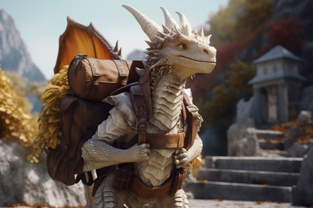 Generative AI, cute kindness dragon adventurer and traveler, anthropomorphic animal wear clothes and big backpack.