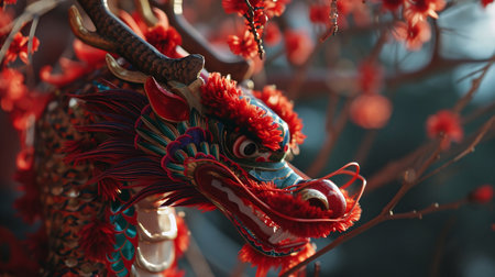 Closeup of an intricate chinese dragon statue with vibrant colors and textures, symbolizing power and culture