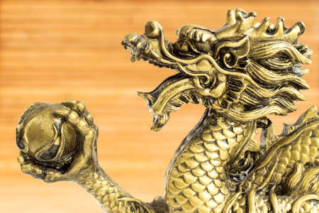 A close-up view of a golden dragon sculpture, showing intricate details and a sense of mythical power. The sculpture's scales, eyes, and teeth are vividly depicted, creating a captivating and dramatic image. The background is blurred with soft lights, adding to the mystique of the dragon.