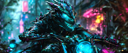 Cybernetic dragon riding a futuristic motorcycle in a neon-lit cityscape