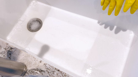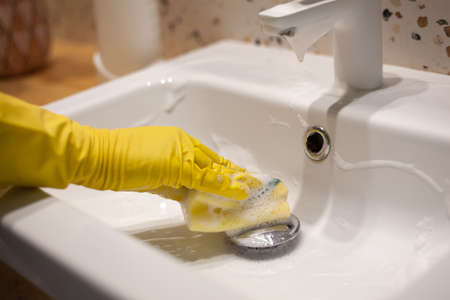 Person cleaning porcelain bathroom wink with foam using sponge and wearing yellow gloves