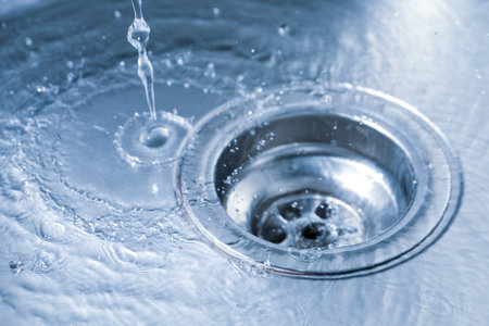 water drops on a plug outlet from new spotless domestic stainless steel sink over layered to form vibrant colors shapes patterns and designs