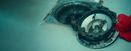 Drain cleaning. Clogged and dirty sewer pipes floor drain. Full of hair and accumulated clogged grease. Maintenance the floor drain sewage system in bathroom. fixing clean wash and unclog a drain.