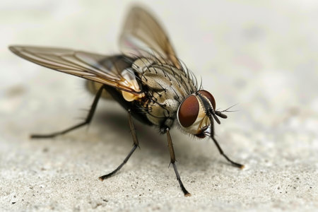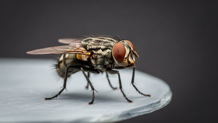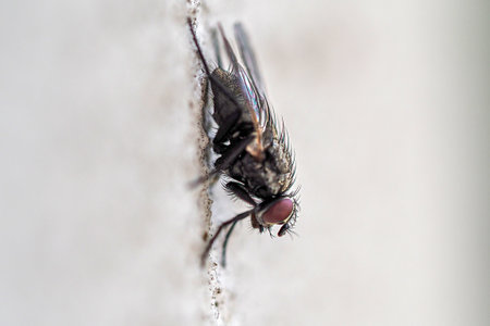 Close-up of housefly on surface with detailed texture and vibrant eyes