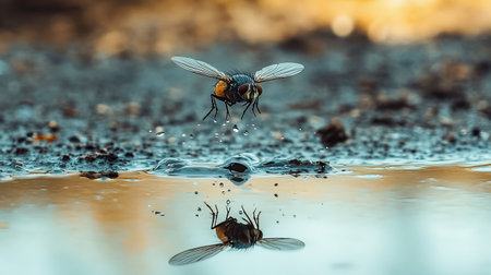 A stunning close-up of a fly hovering near a puddle, highlighting the intricate details of its wings and reflection in the water, capturing nature's beauty.
