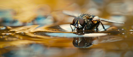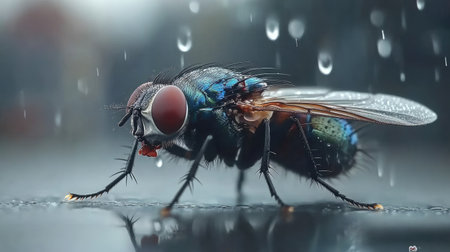 Macro photography of a housefly standing on a wet surface with sparkling water droplets and soft bokeh background.