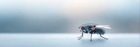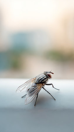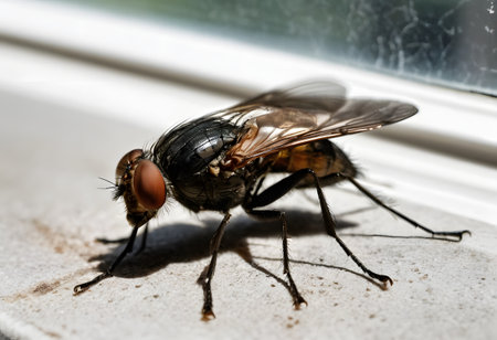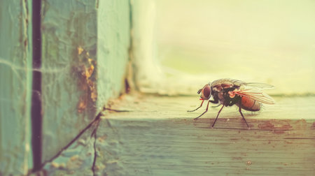 Close up of a housefly standing on a window frame, showcasing its intricate details against a blurred background, creating a captivating image of natures tiny wonders
