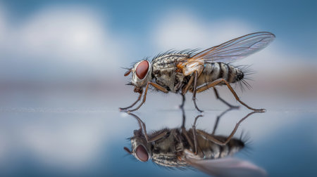 A fly walks slowly on a shiny surface, reflecting the blue sky and clouds above in daylight