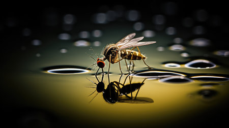 This striking image captures a fly hovering above a shimmering water surface, creating splashes and a captivating reflection, showcasing nature's detail.