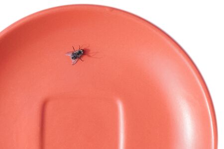 Dead flies lie in a red plate on a white background
