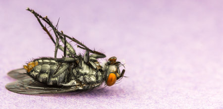A closeup of a dead fly on a purple surface with a blurry background