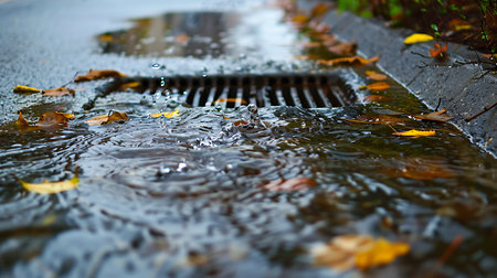 A metal drain cover sits at the center of a puddle on asphalt, reflecting the sky and surrounding environment. Fallen leaves and other natural debris float on the water's surface. The composition uses a low-angle perspective. Ideal for illustrating environmental themes and urban landscape concepts in various applications.
