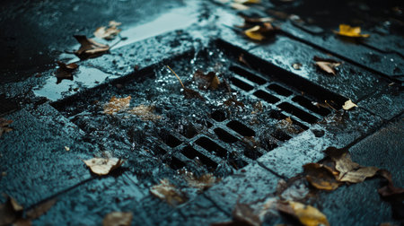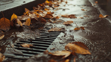 A close up of a drain with leaves and water, AI