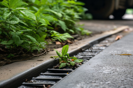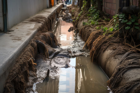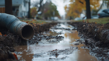 raw sewage flowing from broken pipe onto the sidewalk, created with generative ai