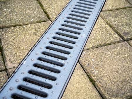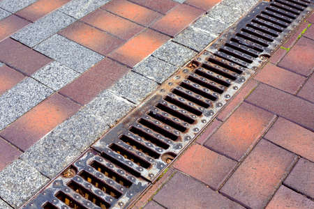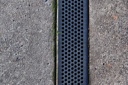Detailed close up of drainage grille in ground. Urban city details concept.