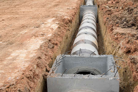 New concrete sewer wells laying of sewerage with construction site during construction site road