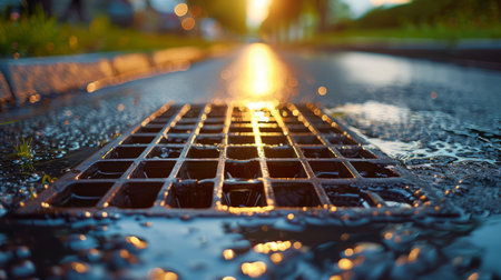A close-up of a water drainage grate on a wet street, reflecting the warm colors of the sunset