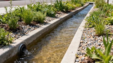 Shallow concrete rainwater retention basin capturing runoff, bordered by mixed green perennial shrubs and ornamental stone mulch under warm daylight conditions.