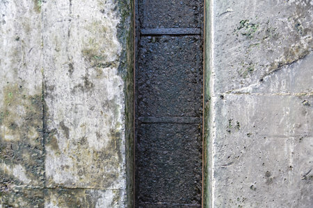 Closeup view of heavy flowing water with splash in the mossy drainage system.