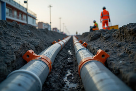 Two industrial pipes being laid in a trench at a construction site with workers in the background.