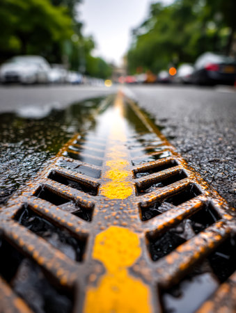 A detailed view of a damp urban drain set against a painted yellow border, with motion-blurred vehicles and lush foliage softly blending in the distance.