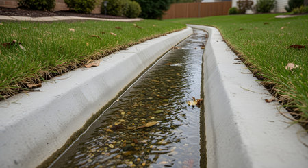 A concrete drainage channel carries a shallow stream of water through a manicured green lawn. Leaves and pebbles rest in the water, illustrating an effective urban or suburban stormwater management system integrated into a landscape.
