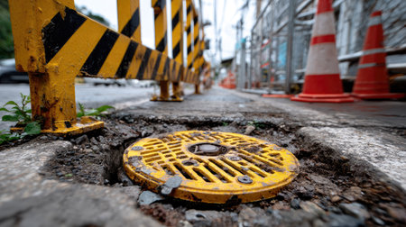 A detailed view of a dirty yellow manhole cover on an urban sidewalk surrounded by construction safety barricades and traffic cones.