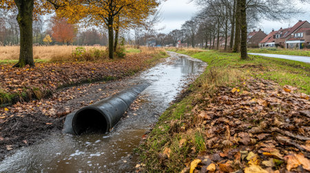 The image captures a pipe discharging muddy water into a natural setting, illustrating the impact of water pollution on the environment with fallen leaves.