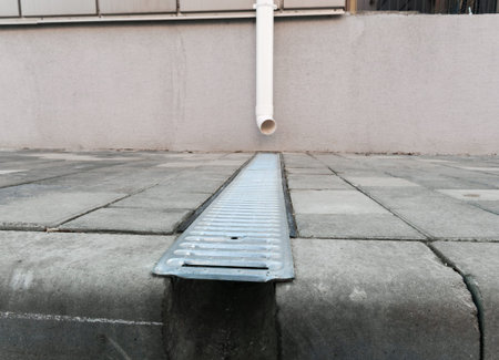 a drainage ditch covered with an iron grate on a sidewalk made of stone tiles and granite stones close-up of a stormwater drainage system from a paved road.