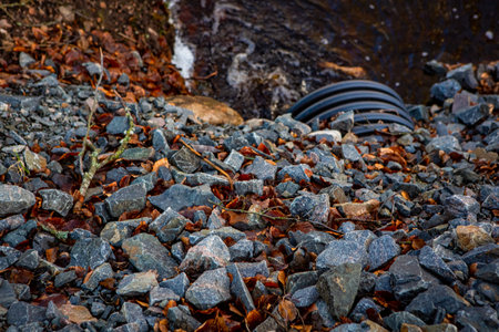 A close-up view of a water pipe draining muddy water into a shallow trench during the autumn season. Fallen leaves surround the area.