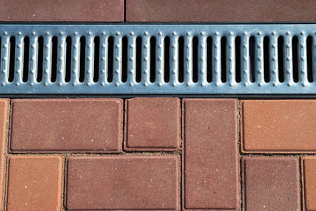 Pavement decoration with decorative rectangular stone tiles with a rainwater drain system. Construction of roads and sidewalks. Geometric shapes, design. Graphic background. Close-up