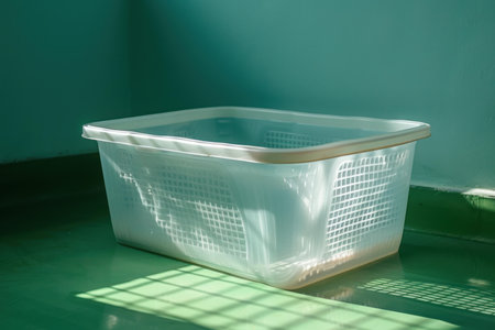 Empty laundry basket bathed in the soft glow of morning sunlight with shadow patterns
