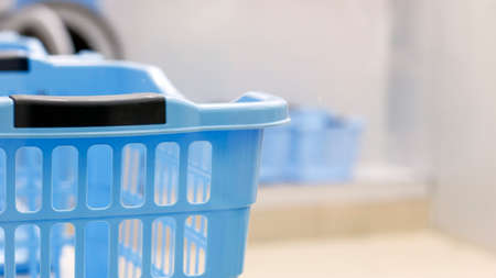 Laundry basket with dirty clothes in laundry room. Selective focus.