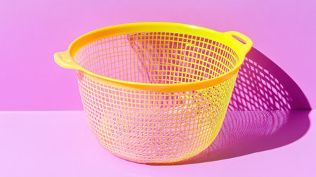 A bright yellow plastic colander sits against a smooth purple surface, showcasing a vibrant contrast that adds a cheerful touch to any kitchen setting.