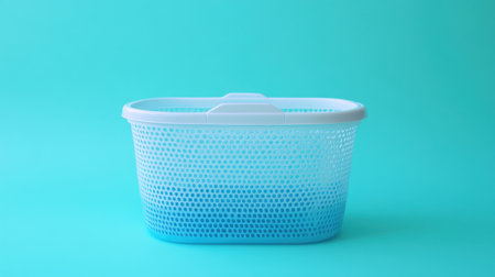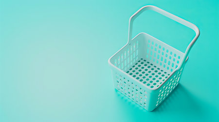 A top view of empty shopping basket on light blue background, showcasing its perforated design and clean lines, evokes sense of simplicity and organization