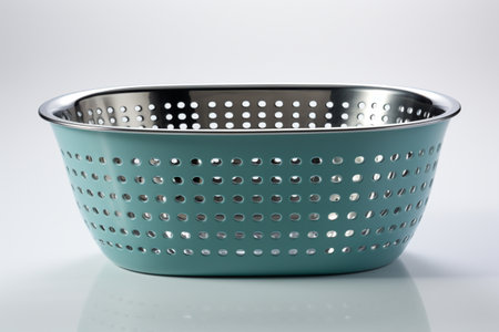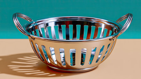 A sleek, shiny metal colander sits against a vibrant background. Perfect for kitchen and cooking visuals, this image captures modern design and culinary essentials.