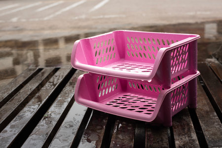 Vibrant, multicolored empty plastic basket basking in natural light, casting shadows