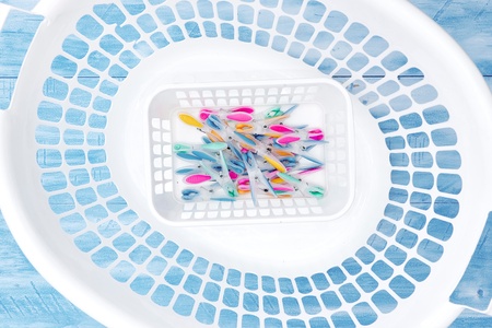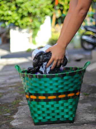 Woman hand putting dirty clothes into a basket in the garden. Selective focus.