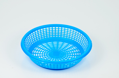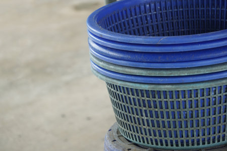 Blue plastic shopping basket on the floor in the kitchen at home.