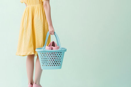 Clad in a stylish yellow dress, a woman stands gracefully holding a blue laundry basket and pink slippers, posing against a serene pastel background.