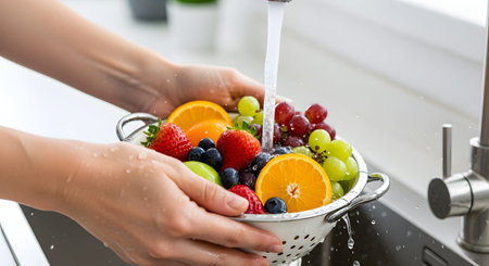 A person's hands hold a white colander filled with colorful fresh fruits like strawberries, grapes, and oranges under running water. The scene takes place at a kitchen sink, emphasizing hygiene, food preparation, and healthy eating habits.