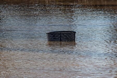 Shopping Basket Fish Trap. In a clear, shallow stream, a black shopping basket lies on its side, acting as