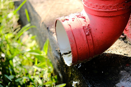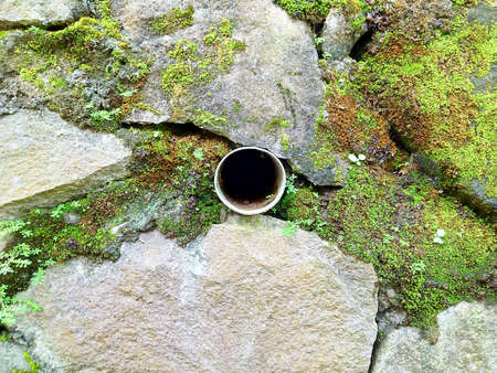 Close up view drain water flowing from the PVC pipe hole. Sanitary sewer concept. Transporting water from rain and houses for disposal. Rural environment sewage system. Selective focus on foreground.