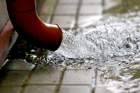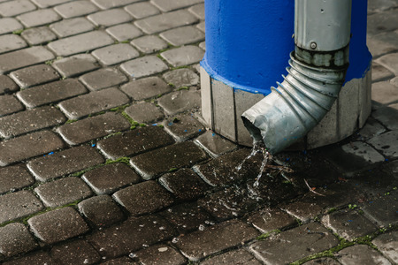 Rain water is pouring from the green draining gutter on the pavement, selective focus, Nida, Lithuania
