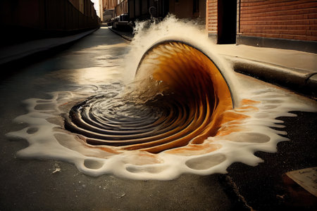 sewer water flowing onto sidewalk, with the smell of sewage in the air, created with generative ai