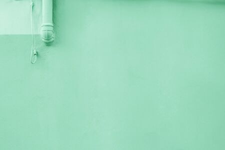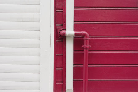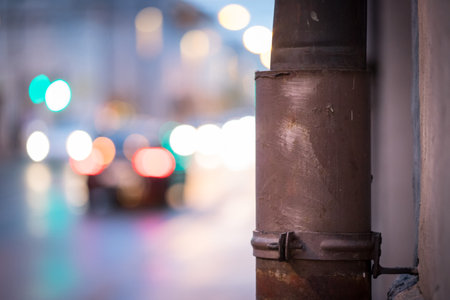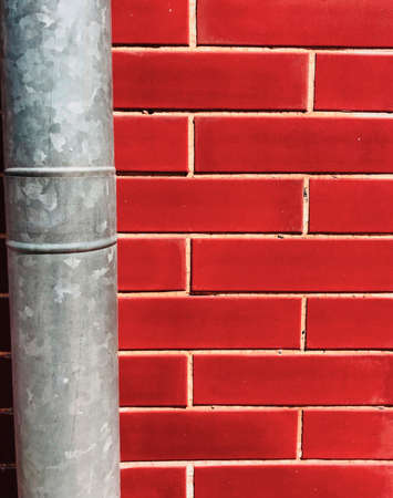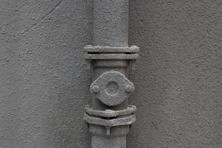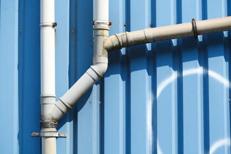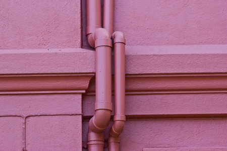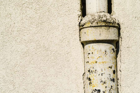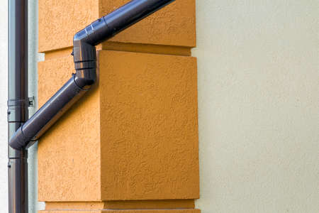 Thick drainpipe on house wall outdoor. Rainwater protection objects, building features concept.